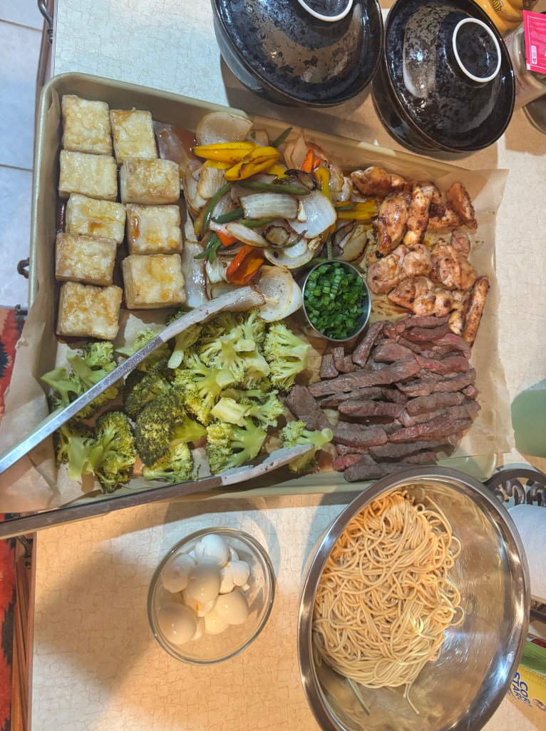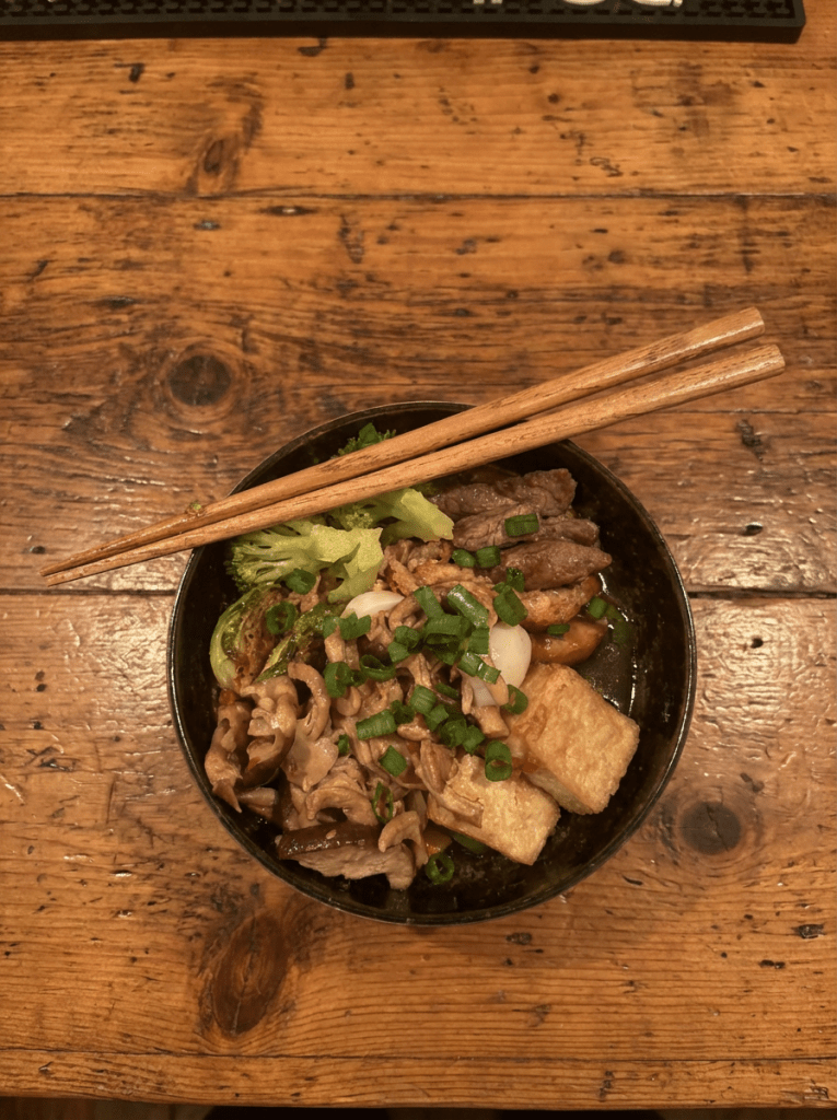 - A deeply savory ramen bowl layered with umami broth, a touch of heat, pan‑seared tofu, medium‑rare steak, tender chicken, roasted vegetables, and soft‑boiled quail eggs. A full feast in one bowl.