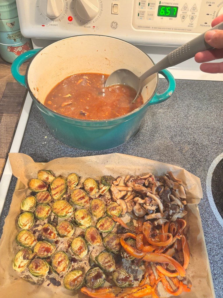 - Toss broccoli, Brussels sprouts, and mushrooms with oil, salt, pepper, and soy.